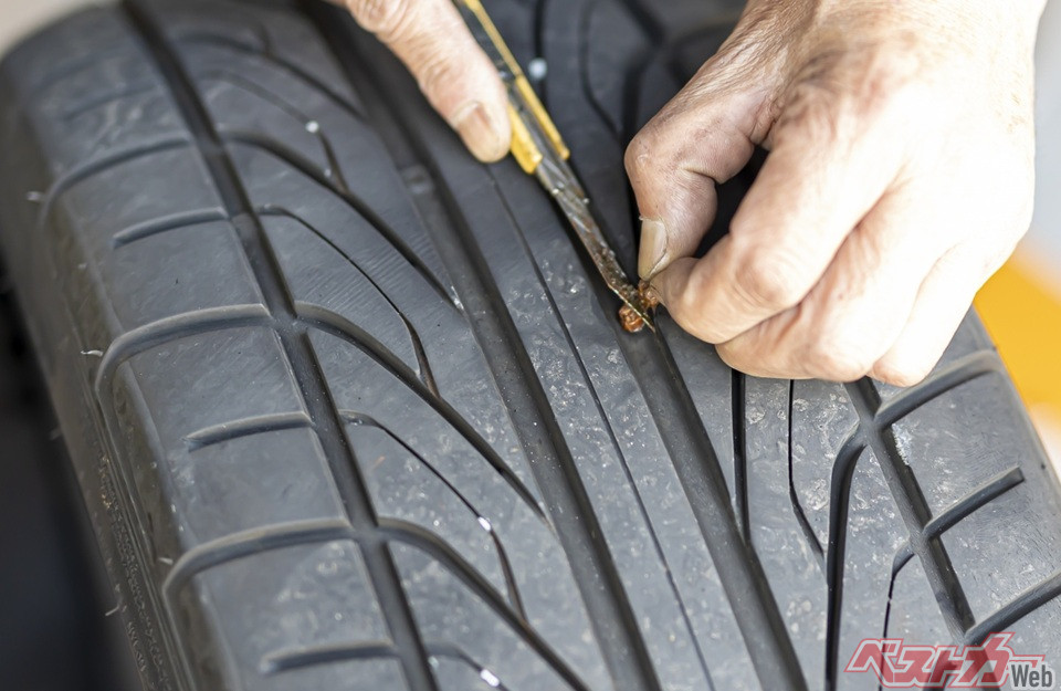 万が一異物が刺さっているのを見つけてもすぐに抜かないこと。異物を抜くと空気がすぐに抜けて走行不能になるため、スペアタイヤへの交換など、作業に自信のない人はタイヤ専門店などで対処してもらう。