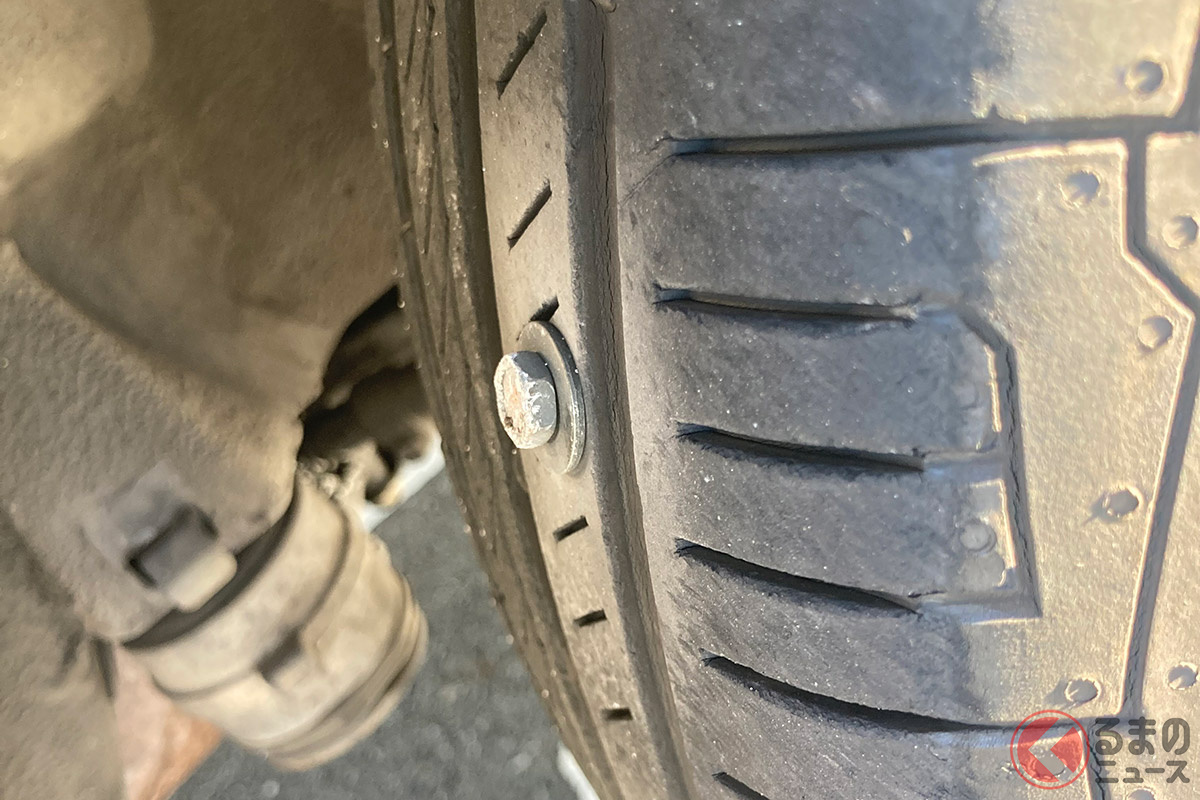 道路に落ちている釘やボルトなどを踏んでしまってパンクに至るケースはよくあり、その場ですぐに空気が抜けてしまうものと、数時間かかって徐々に抜けていくケース(スローパンク)があります。