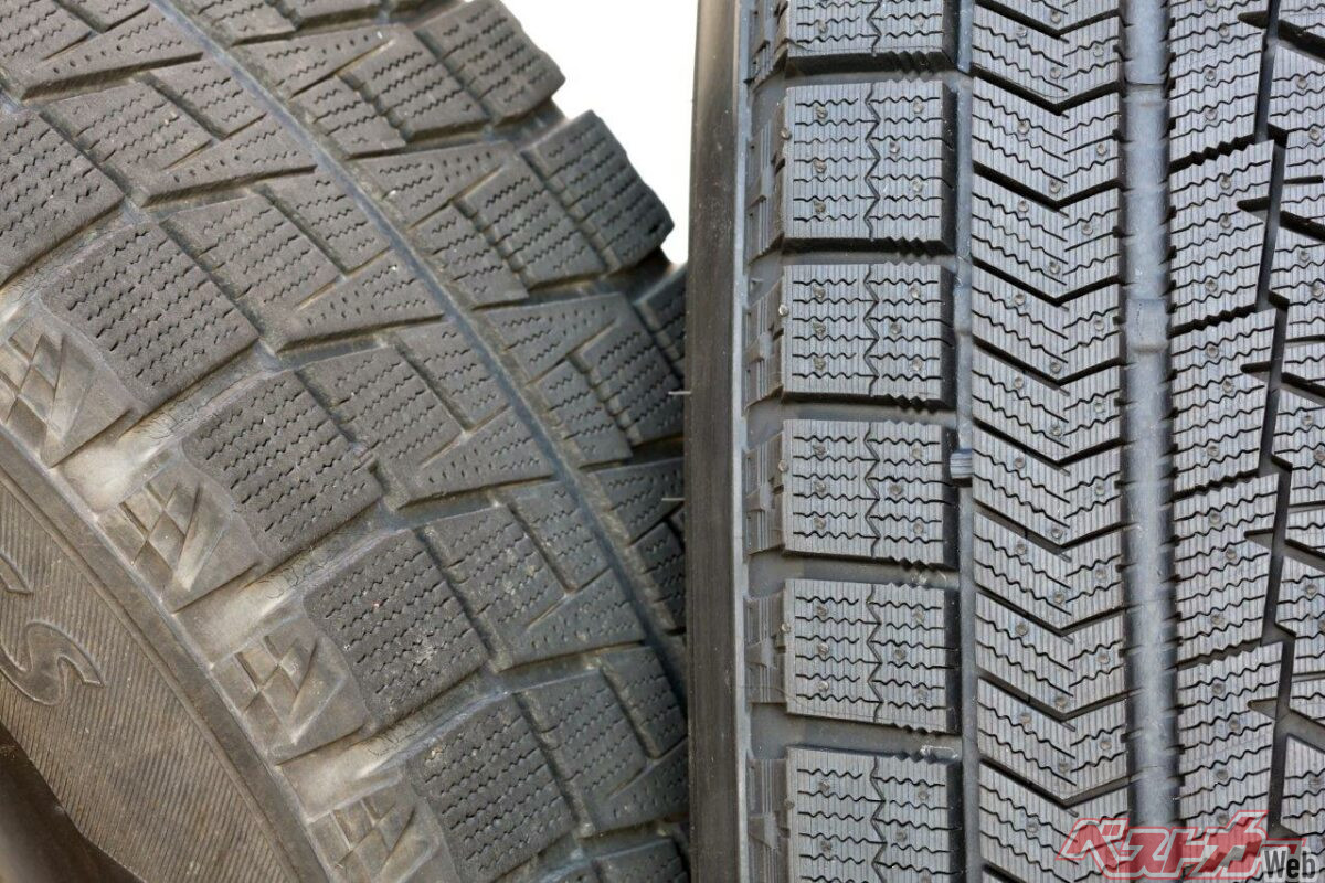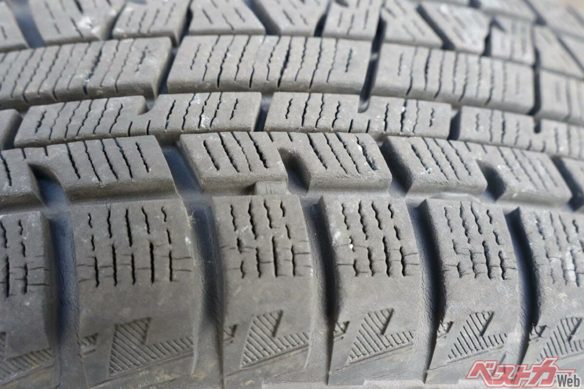 タイヤ側面の製造年(週/年表示)を必ず確認し、「今年で何年目か」を把握したい。また、ひび割れや硬化がある場合、残溝があっても冬道では危険である。