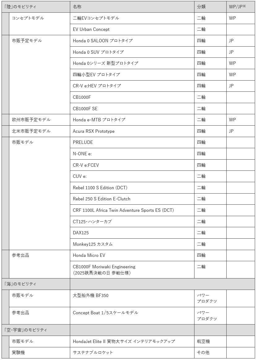 Hondaブース展示物一覧(予定)
