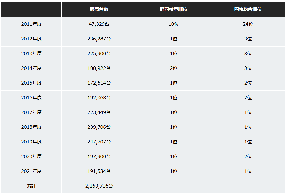 新車販売台数においては2019年度以来、軽四輪車 新車販売台数においては7年連続の首位獲得となります。