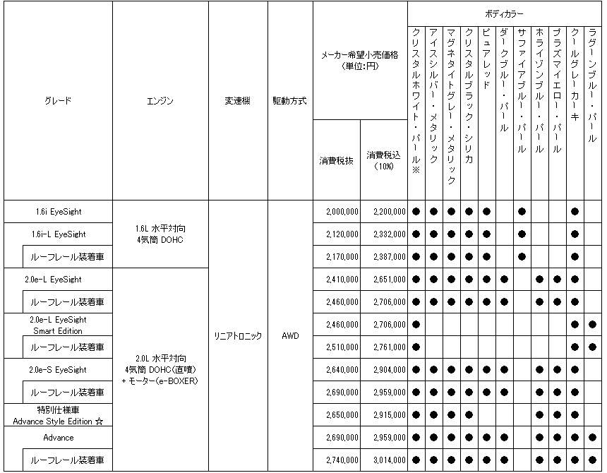 *1:2.0e-S EyeSight、Advanceは標準装備。その他の2.0Lモデルは運転席/助手席パワーシートとセットオプション、