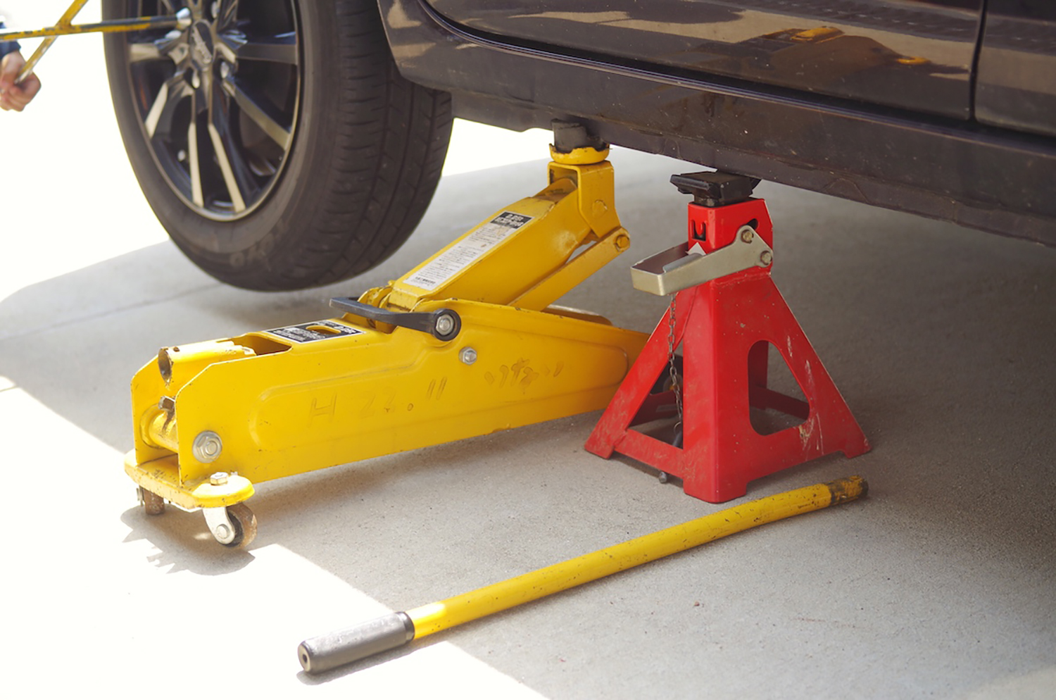 タイヤを外すときにジャッキアップするが、そのときに車体を支えるのがリジッドラック(通称:ウマ)。ジャッキだけで作業をしている人がいるが、これは大変危険。ジャッキはクルマをもち上げるための道具で、そのまま保持するための道具ではないからだ。油圧ジャッキであれば、オイルが漏れて、下がってくることも珍しくない。