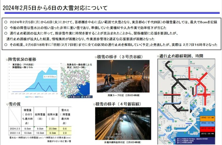 2024年2月、大雪による積雪で東京都心でも最大8cmを記録し、広い範囲で積雪が発生した。この際、首都高速では早めに通行止めが行われ、関係機関と連携して除雪作業を実施したものの、解除見通しが延期されるなど対応が長引いた事例がある。