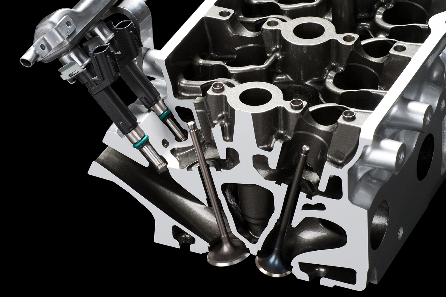 ターボユニットの性能向上に歩調をあわせ、霧化効率の高い燃料噴射インジェクターの開発・採用も大きく効いている。簡単にいってしまえば燃焼効率の引き上げだが、加えていうなら燃料噴射方式に関しても、吸気管内に噴射する間接噴射からシリンダー内に直接噴射する直接噴射方式、いわゆる直噴方式の実用が大きなポイントとして効いている。シリンダー内に直接燃料を噴射するため、ノッキングを抑えたり圧縮比を高く設定でき燃焼効率が向上。かつてと同じパワーを得るのに、少ない燃料量で済むようになったのだ。
