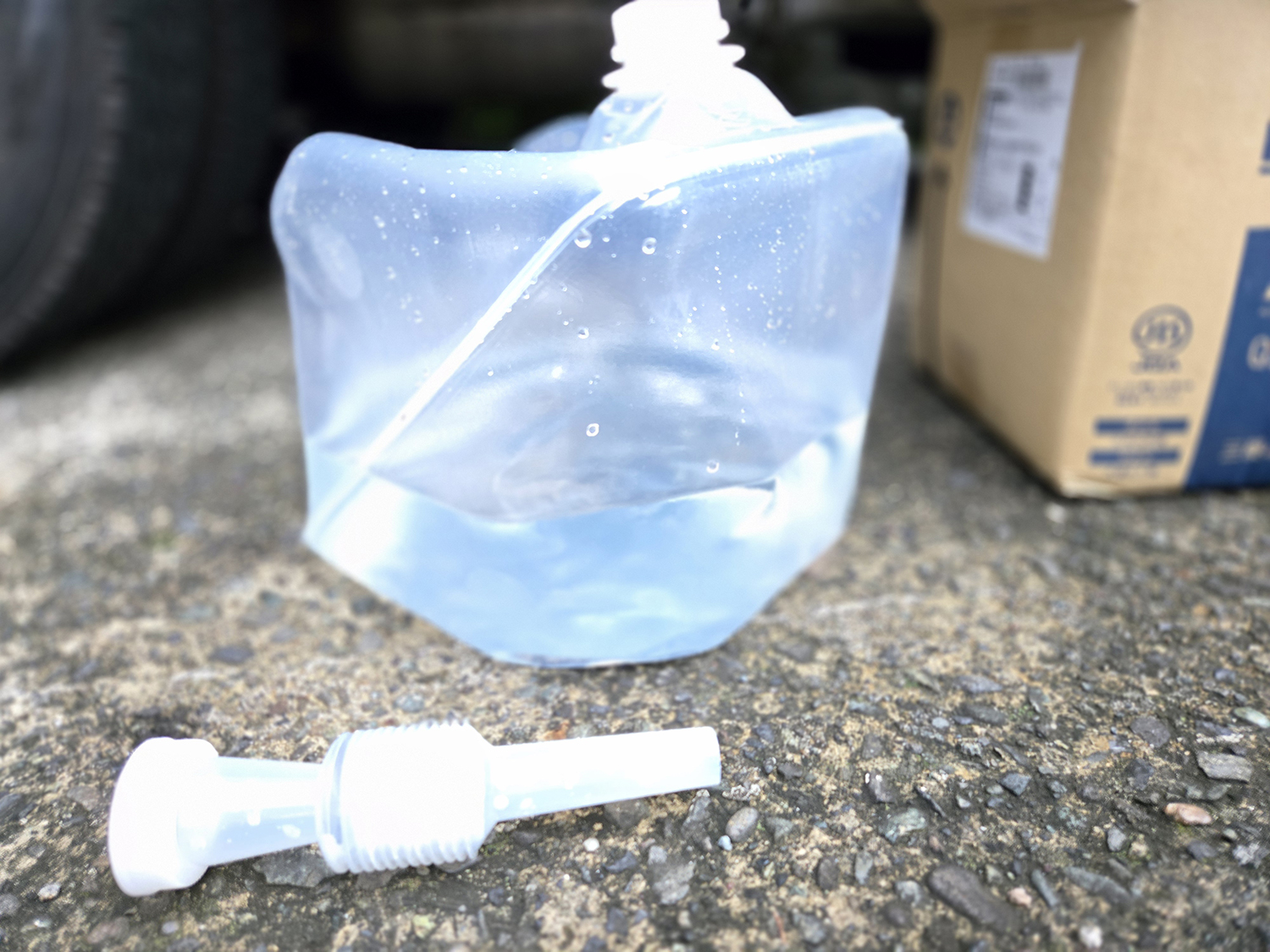 そしていよいよ段ボールの中身とご対面だ。蓋を開けてみるとプニュプニュした透明の容器に無色の液体が入っていた。じつはこの容器を初めて見るまでは、絶対に金属製の缶に入っていると思っていた。無知とは恐ろしい。
