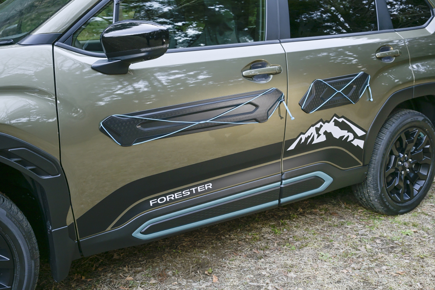 そんなドアパンチ防止プロテクターは、新型フォレスターの純正アクセサリーにも用意されている。幅広の「ボディサイドプロテクター」で、ボディをドアパンチから守る樹脂製プロテクターだが、ロードバイクを一時的に立てかけるのにもいいとされ、停車時にバンジーコードやパラコードを張って、ウエアやサングラスなどを引っかけておくこともできるから便利だ。