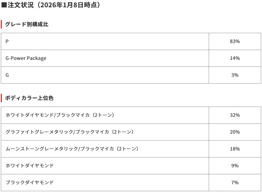 ご予約いただいたお客様からは、S-AWC採用による優れた操縦性への期待に加え、迫力が増したエクステリアデザインや8インチ液晶メーター、強化された予防安全機能を高く評価いただいており、予約注文では、最上級グレード「P」が、全体の8割以上のお客様に選ばれています。