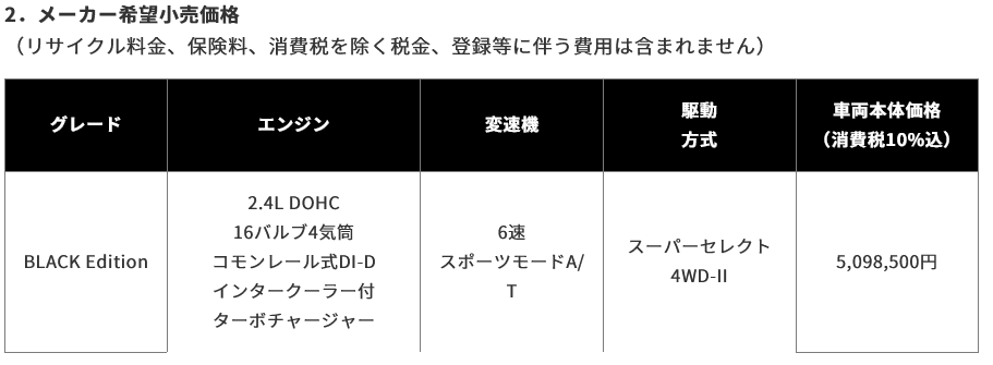 ベーシックグレードの「GLS」をベースにルーフレールを追加し、18インチアルミホイールやサイドステップ、その他のメッキ/シルバーパーツと併せてブラックに統一。フロントバンパーガーニッシュ、フォグランプベゼル、電動格納式ヒーテッドドアミラー、アウタードアハンドル、リヤゲートハンドル、リヤバンパーはブラックメタリックで統一するなど、エクステリアの要所をブラック化することで、精悍かつ力強いスタイリングとしました。