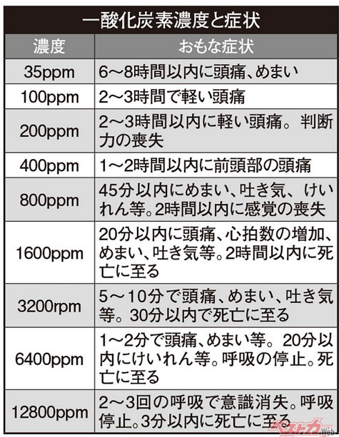 JAFのテストではアイドリング状態で5分経過すると車室内の一酸化炭素濃度は200ppmに達し、20分経たずに800ppmを超えることが分かった。