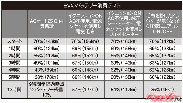 JAFのテスト結果では、外気温マイナス9℃の19時に実験開始。ヒーターを使用すると10時間で残量10%。立往生解消時の移動を考えるとある程度の電池残量が必要だ。