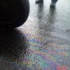 また濡れた路面では、匂いとともにガソリンや軽油が油膜となり、虹色のような模様(オイルの場合も同様)が広がるのでわかるはずだ。