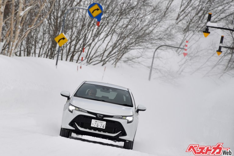 交差点や停止線の付近は、クルマが停止・発進を繰り返すため、路面が踏み固められてツルツルになっていることが多い。特に停止線直前はアイスバーン化している場合もあるので、早めのブレーキ操作を心がけ、発進時には少し前からゆっくりと動き出す工夫が有効だ。