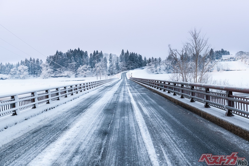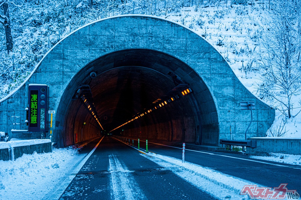 風通しの良い橋や陸橋、そしてトンネルの出入口付近は、とくに路面が凍結しやすいポイントだ。これらの場所は周囲より気温が低く、雪が解けてもすぐに凍結してツルツル路面になるアイスバーンが発生している可能性が高い。
