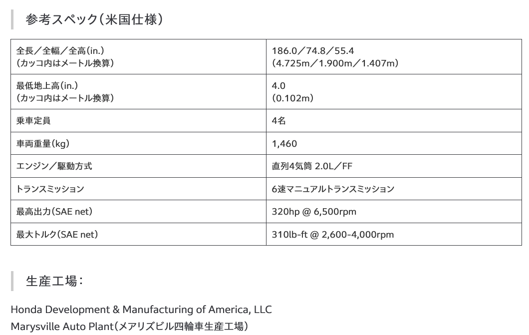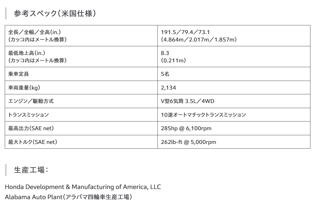なお、両モデルはHondaの米国における四輪開発・生産拠点である「Honda Development & Manufacturing of America, LLC(ホンダ・ ディベロップメント・アンド・ マニュファクチュアリング・オブ・アメリカ)」にて生産されています。