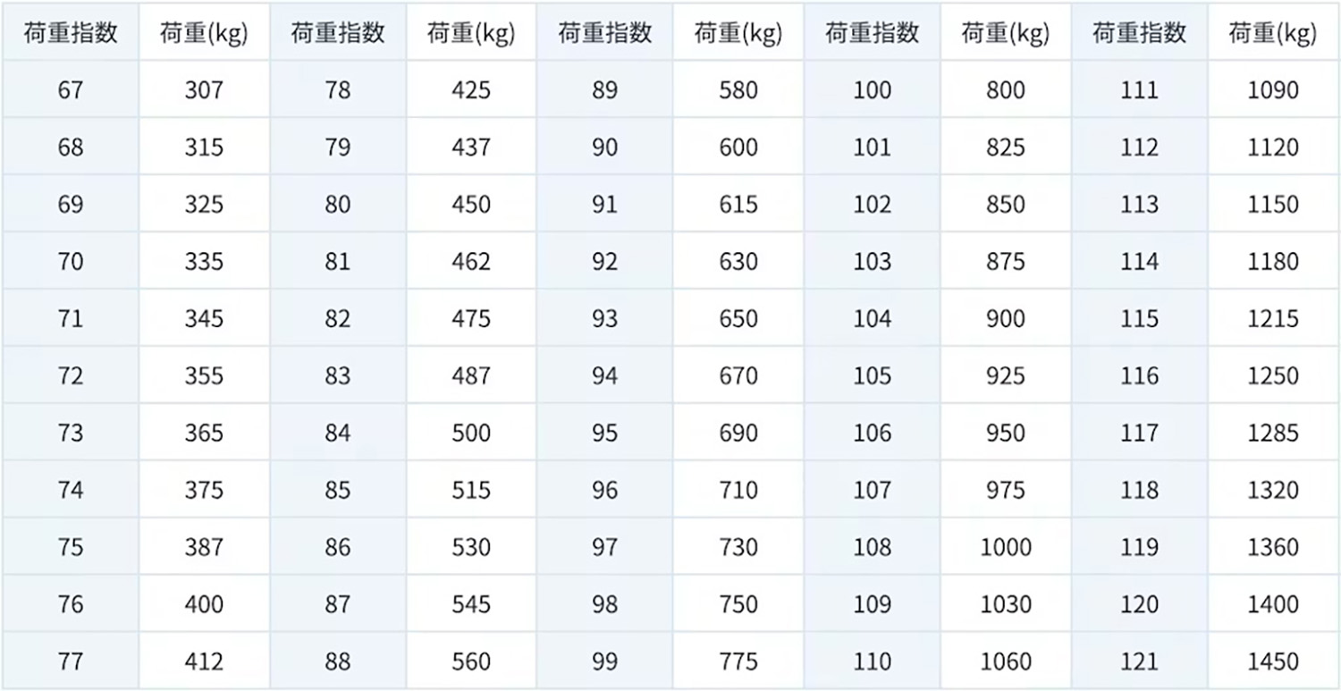 タイヤでまず気にしなければならないのは、どれくらいの重さに耐えられるかというタイヤインデックスの表示である。そのまま重量を表しているわけではないのでややこしく、数字の意味する耐荷重は、表で示されている。