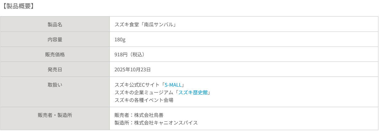 ブライダルやレストラン事業を展開する株式会社鳥善(本社:静岡県浜松市、代表取締役:伊達善隆、以下「鳥善」)とスズキ株式会社(本社:静岡県浜松市、代表取締役社長:鈴木俊宏、以下「スズキ」)は、お客様にご好評いただいている「スズキ食堂 インドベジタリアンレトルトカレー」に新味「南瓜サンバル」を追加して10月23日より発売を開始しました。