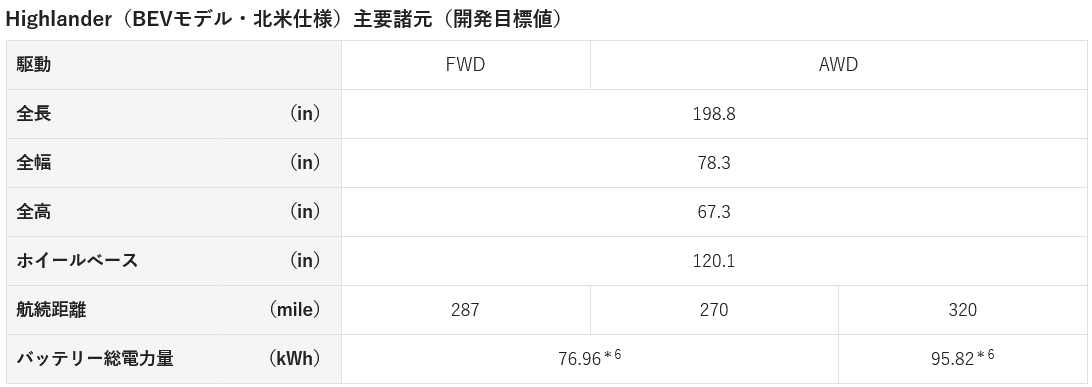 今回、北米市場においても「マルチパスウェイ」の取り組みを着実に進めるべく、重要な選択肢であるBEVモデルを「Highlander」に新たに設定しました。「bZ*1」「TOYOTA C-HR*2」「bZ Woodland*3」に続く第四弾として、Toyota Motor Manufacturing Kentucky(TMMK)にて生産を行います。