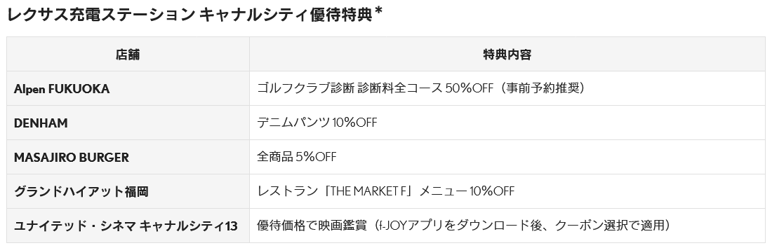 東京ミッドタウン日比谷、軽井沢コモングラウンズ、大名古屋ビルヂング、JRセントラルタワーズ、グラングリーン大阪、ONE FUKUOKA BLDG.に続き、7ヶ所目となるレクサス充電ステーションを2025年度内に、キャナルシティ博多(福岡県福岡市博多区住吉1丁目2)の隣接スペース(福岡県福岡市博多区住吉1丁目4-12)に開設します。最大60日前から事前予約が可能なレクサス充電ステーションは、近隣の商業施設と連携して、お食事やショッピング等、ご利用者の皆様に有意義な時間を過ごしていただけるような多様なサービスを提供します。