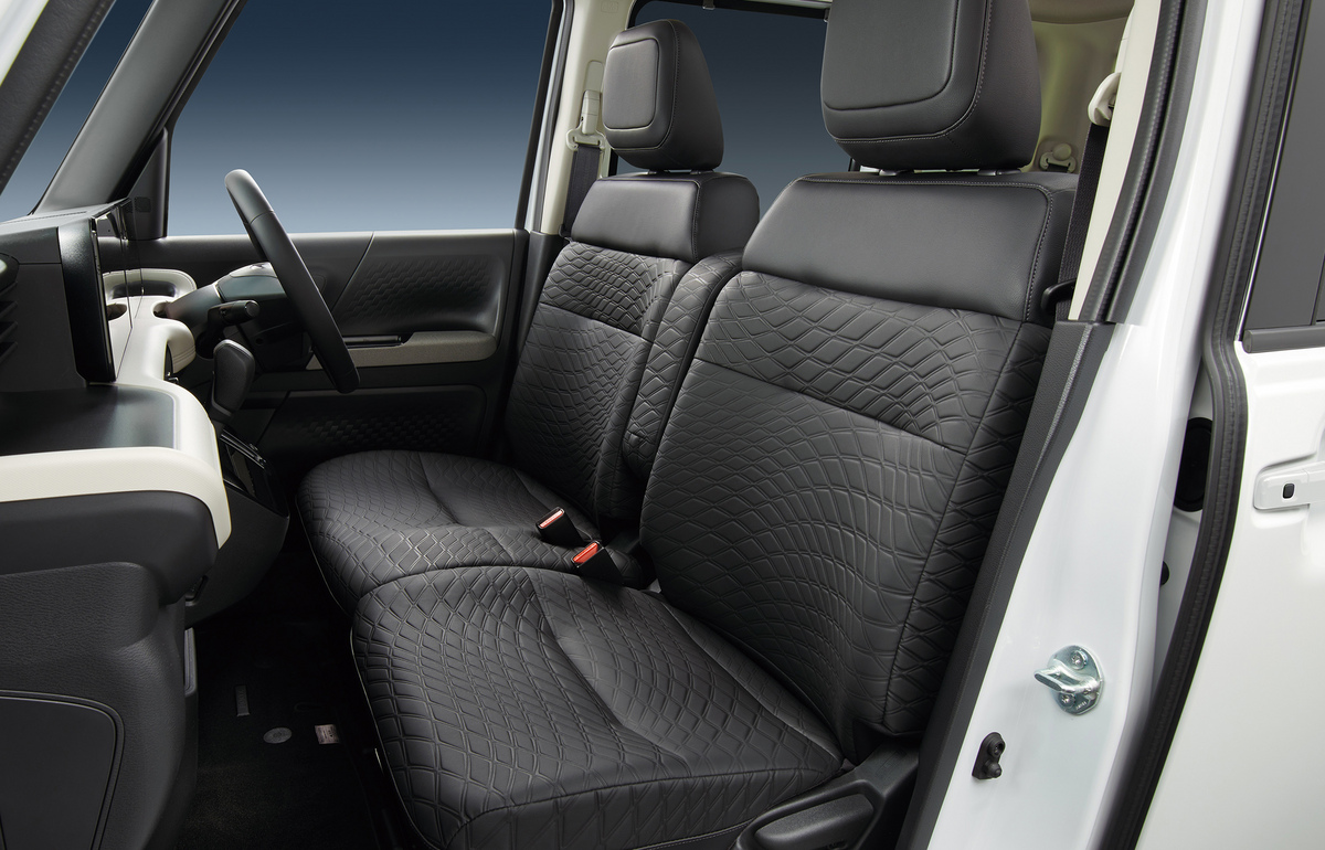 ルークス「AUTECH LINE」は、クール&アグレッシブを商品コンセプトに、さりげない個性やこだわりをクルマに求めるお客さまに向けてラインアップしているカスタムカーです。エクステリアには、自然吸気エンジングレード専用デザインの14インチアルミホイールのほか、専用フォグランプフィニッシャーやシルバー色ドアミラーを装備し、「ルークス」で唯一のブラック基調のインテリアを採用しています。シート地には、スタイリッシュな意匠と上質な手触りに加え、防水機能も兼ね備えた専用の合皮素材を採用。お手入れも楽に行え、お子さまとのお出掛けやアクティブな使用シーンでも水濡れや汚れを気にせず使用できます。
