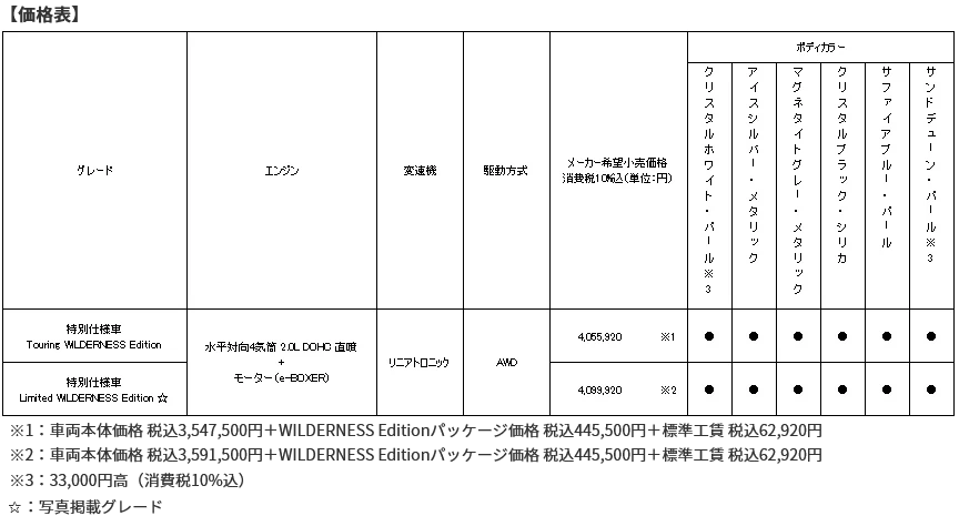 特別仕様車「Touring WILDERNESS Edition」、「Limited WILDERNESS Edition」は、両モデル合わせて500台の限定販売とし、2025年10月30日から2025年11月30日の期間中に全国のSUBARU販売店で抽選申し込みを受け付けます。