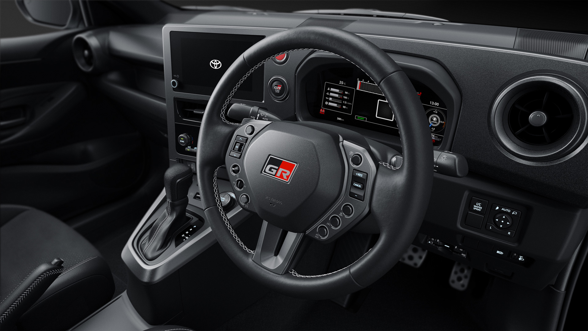 新意匠のGRステアリングは、ドライビングにおける操作性を追求して作り込みました。モータースポーツでは、舵角180度でも持ち替えなしでステアリング操作を行う場面があり、従来のステアリングではスイッチに触れないように配慮が必要で、「手のひらを理想的な位置に置けない」という声がありました。これを受けてスタートした開発では、粘土で形作った試作品を車両に装着してサーキットへ持ち込み、プロドライバーと繰り返し評価を実施。その結果、操舵レスポンス向上のための小径化と、コーナリング時の押し操作で手のひらにフィットする左右グリップ形状へと至りました。また、ステアリングスイッチはモータースポーツを通して得た学びを活かし、それぞれのスイッチを独立させた配置にすることで操作性を向上したほか、スイッチ外周のリング状のイルミネーションにより夜間の視認性を向上させています。
