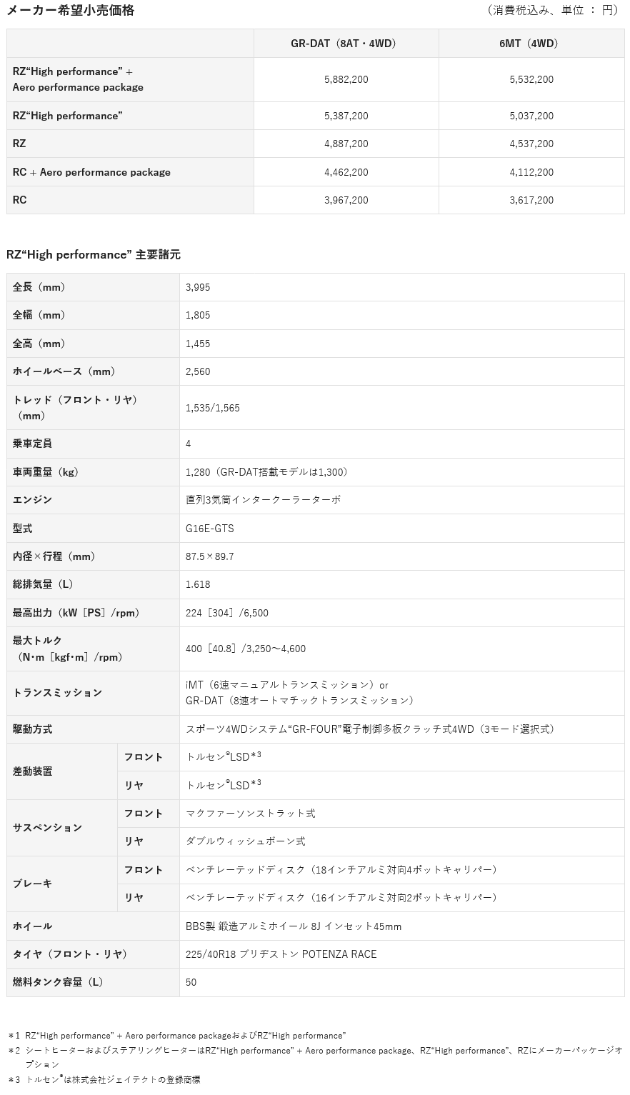 RZ“High performance” + Aero performance packageおよびRZ“High Performance”の標準装着タイヤを「ブリヂストン POTENZA RACE」に変更しました。モータースポーツにおける高いグリップ性能を長時間維持させるため、現場でのテストを重ねて新開発したタイヤです。トレッドパターン、内部構造、ゴム配合を見直すことで、限界領域における車両のコントロール性を大幅に向上させました。市街地走行からサーキットでの限界走行まで、安定したパフォーマンスを実現します。また、タイヤ性能を最大限に引き出すため、フロントおよびリヤのショックアブソーバーの減衰力特性の最適化も行いました。